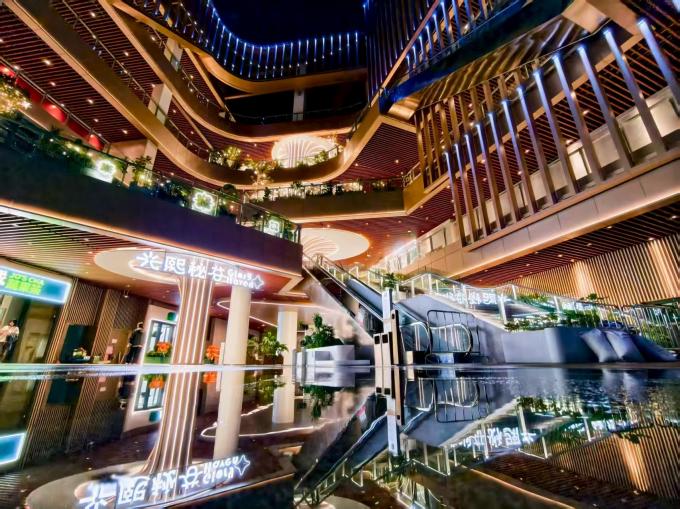 外广场精心规划的1000平方米叠层主题社交空间——“光熙秘谷”,通过飞旋而出的悬浮空间、自然景观绿植、休憩设施及露天阶梯广场,形成层次丰富的互动图景;夜幕下,花池暖光轻笼,树木在灯影里舒展轮廓,水光灵动闪耀,叠层空间仿若被温柔环抱的秘境。与之衔接的漫步式街区延续轻松氛围,汇聚全时段休闲餐饮与丰富的趣味主张品牌,与购物中心场内商户,共同为顾客编织出集品质消费、社交体验于一体的多元生活新天地。