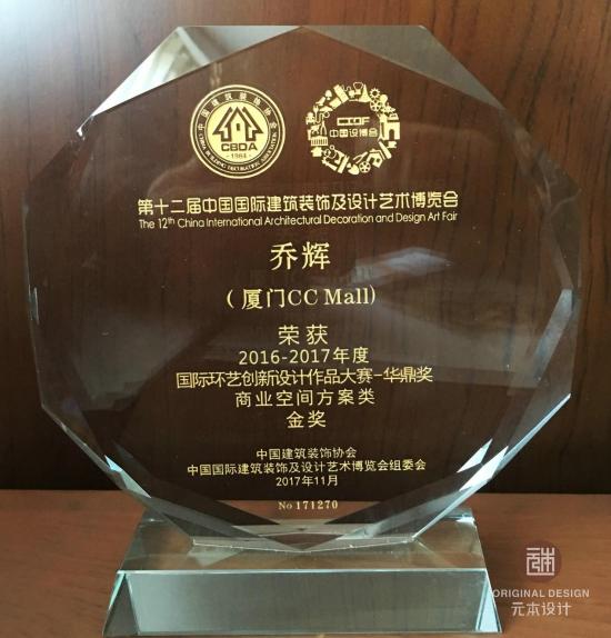 本次国际环艺创新设计作品大赛(华鼎奖)评选由主办单位专家组、国际知名的建筑设计、室内设计专家、学者和权威媒体共同组成评审委员会,对入围企业/设计师进行评估。经过层层选拔,元本设计乔辉作品《厦门CC Mall》斩获华鼎奖全国商业空间方案类金奖。