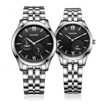 2016年新品以男女对表形式呈现,搭载进口全自动机械机芯,透视底盖清晰可见机芯运作。男女表在设计细节上做了区别,更加匹配男女士对美的不同追求。除了经典的黑色,间金色之外,新款首次采用钢蓝色表针和字钉,为商务用表融入活力元素,同时视觉上更加清爽。大两针搭配60秒功能小眼显示时间,为当下手表的热门设计,男表9时位增加一个24小时功能小盘,方便知晓和调教多维度时间。表盘上的“ASIA”标识体现腕表的身份和纪念价值。